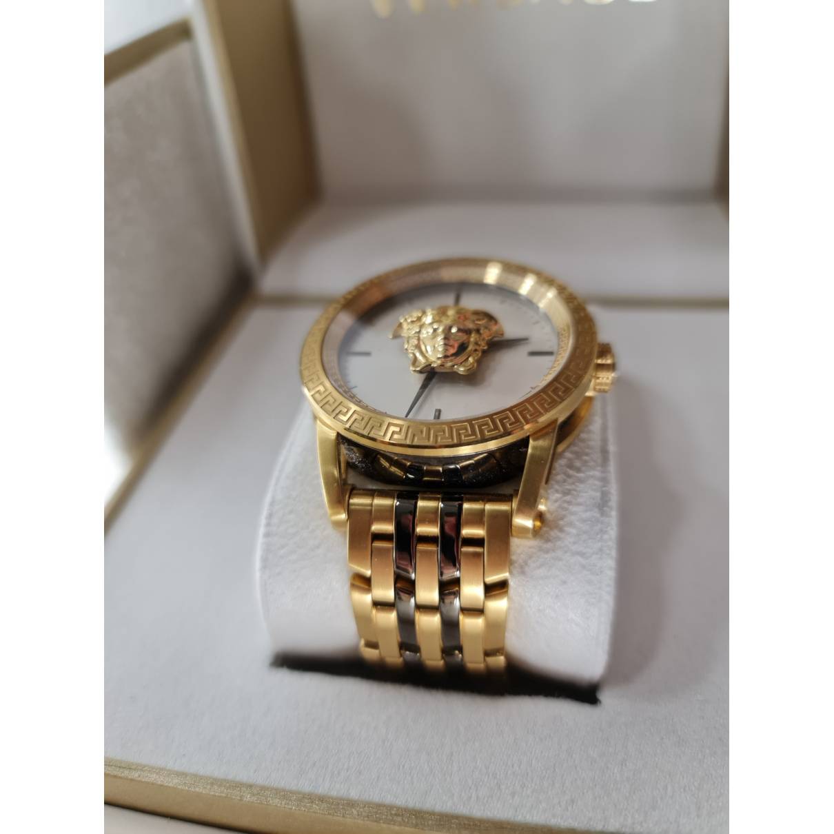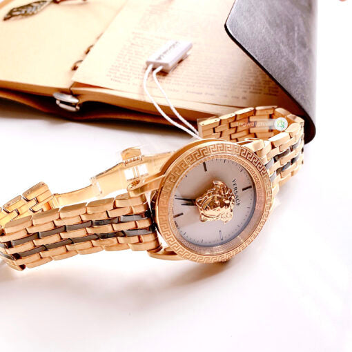 Yellow gold ion-plated stainless steel case with a two-tone ( gold-tone and bronze) stainless steel bracelet. Fixed (greca pattern) yellow gold ion-plated stainless steel bezel. White dial with bronze hands and index hour markers. Minute markers around the outer rim. Dial Type: Analog. Quartz movement. Scratch resistant sapphire crystal. Pull / push crown. Solid case back. Round case shape, case size: 45 mm, case thickness: 13 mm. Butterfly clasp. Water resistant at 50 meters / 165 feet. Functions: hour, minute, second. Palazzo Empire Series. Dress watch style. Watch label: Swiss Made. Versace Palazzo Empire Quartz White Dial Mens Watch VERD00418.