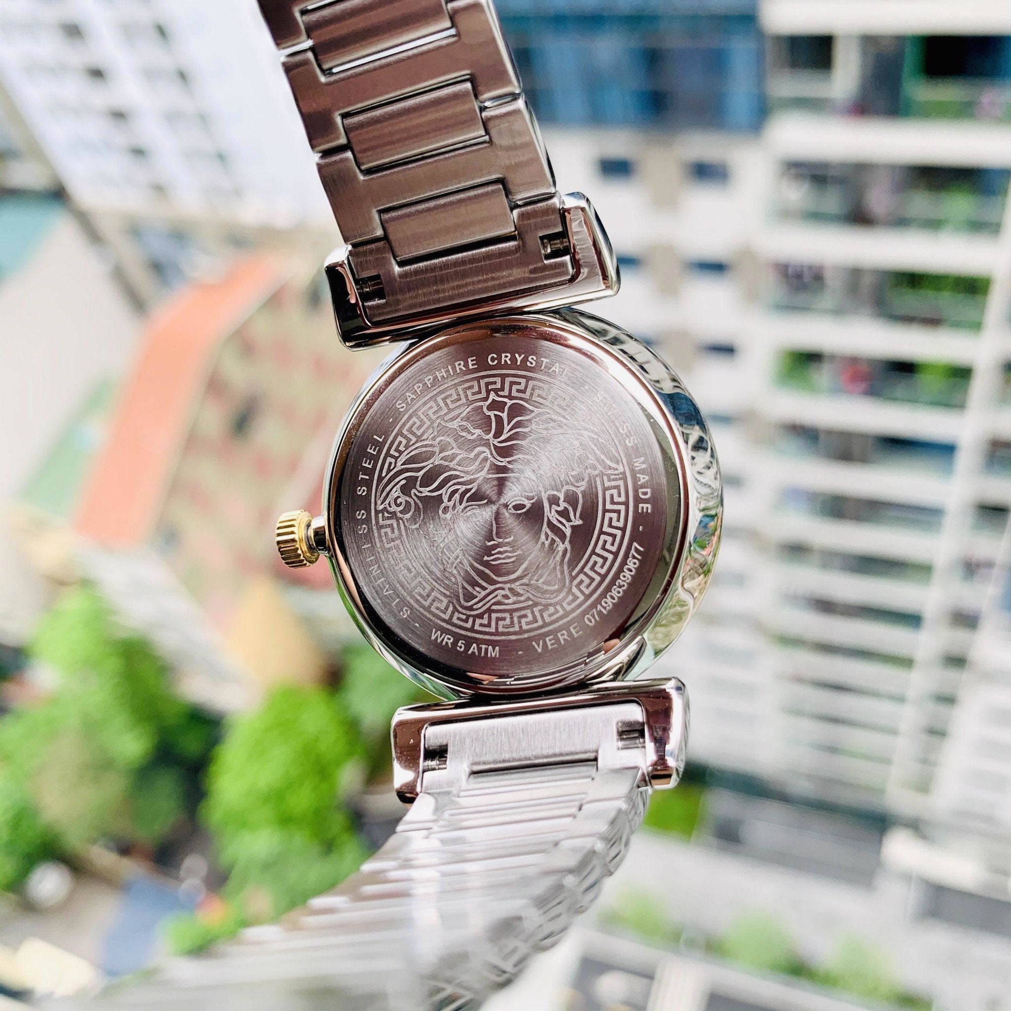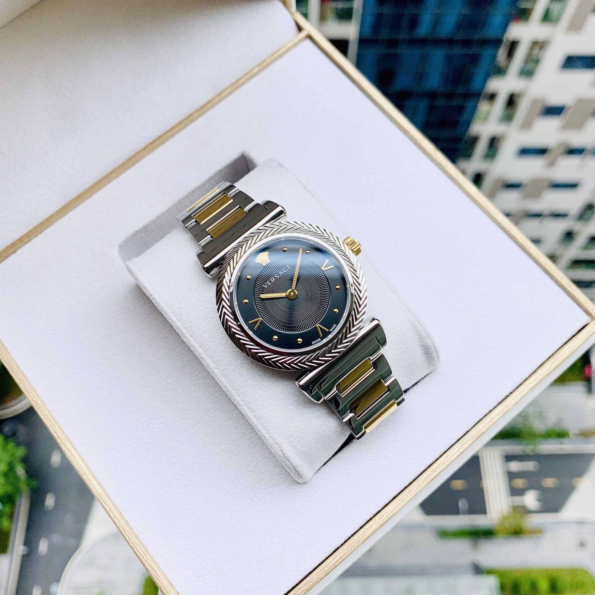The Versace V-Motif series watch features a stainless steel 35 mm case, with a fixed bezel a black dial and a scratch resistant sapphire crystal. This beautiful wristwatch, powered by quartz movement, supports: hour, minute functions. This watch has a water resistance of up to 165 feet/50 meters, suitable for short periods of recreational swimming, but not diving or snorkeling. This stylish Swiss-made timepiece is sure to complete any woman’s collection.