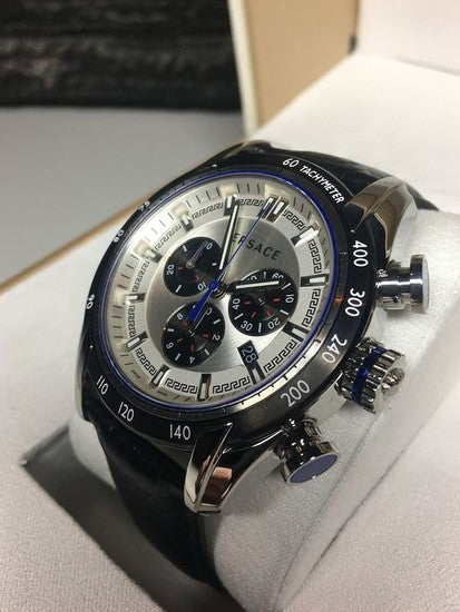 - Watch featuring round white dial with Greca-patterned border, date window, and contrast chronograph subdials