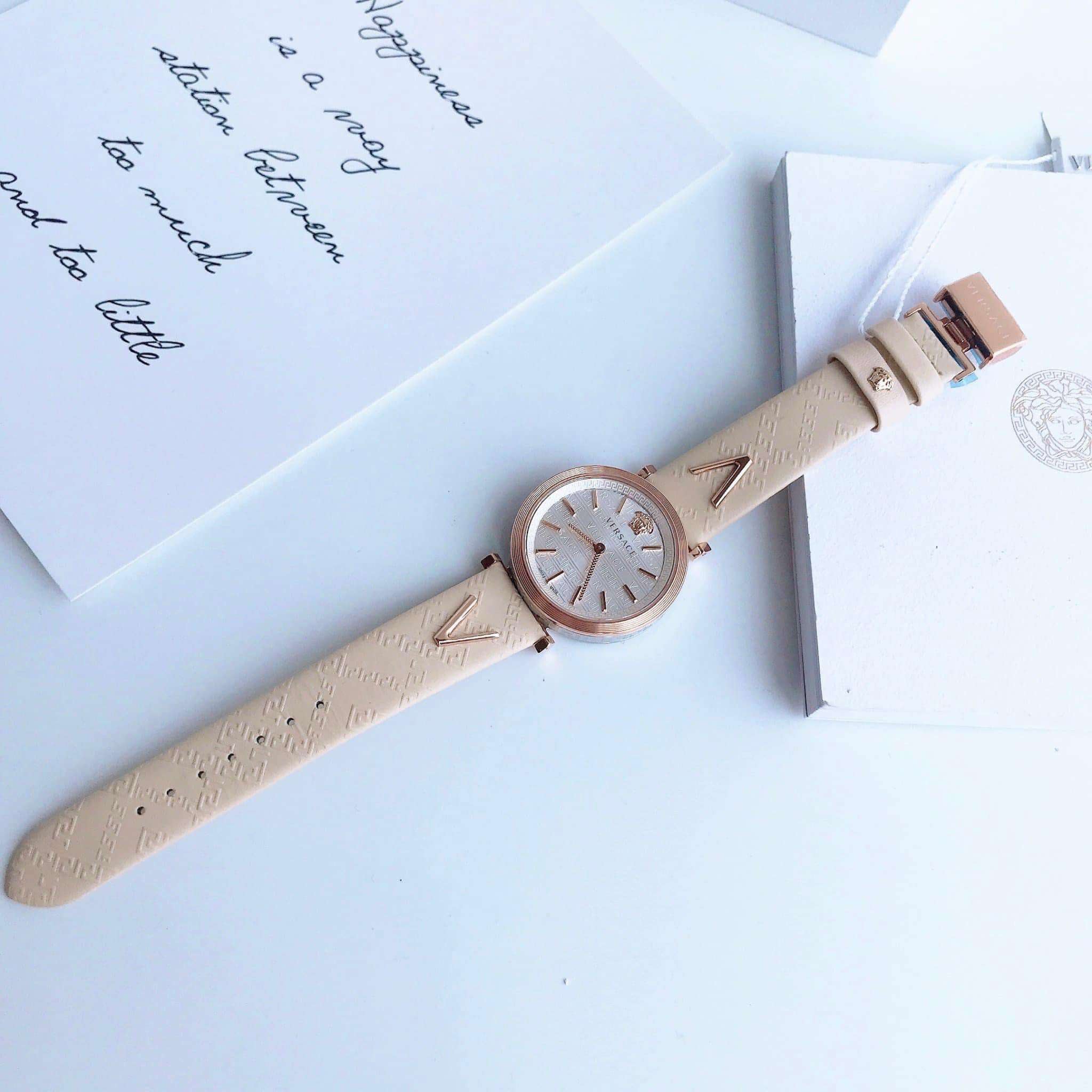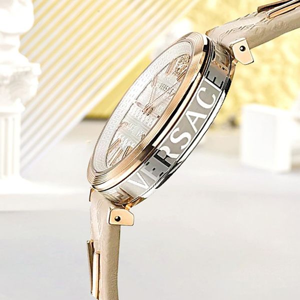 Rose gold ion-plated stainless steel case with a ivory leather strap. Fixed rose gold ion-plated bezel. White (greca pattern) dial with rose gold-tone hands and index hour markers. A 3D Medusa head logo appears at the 12 o'clock position. Dial Type: Analog. Quartz movement. Scratch resistant sapphire crystal. Pull / push crown. Solid case back. Round case shape. Case size: 36 mm. Butterfly clasp. Water resistant at 50 meters / 165 feet. Functions: hour, minute. V-twist Series. Dress watch style. Watch label: Swiss Made. Versace V-Twist Quartz White Dial Ladies Watch VELS00419.