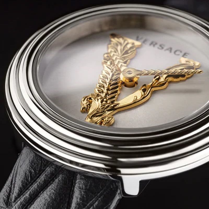 Inspired to the Versace Virtus Theme, the timepiece comes with a recall of the iconic V Baroque embossed on the leather straps recalling the Virtus Accessories patterns or in the dial to emphasize the Virtus presence. The strap comes in two different color combinations in perfect coherence with Versace Virtus accessories. The metal band proposal exquisitely sophisticated embraces a jewellery concept.